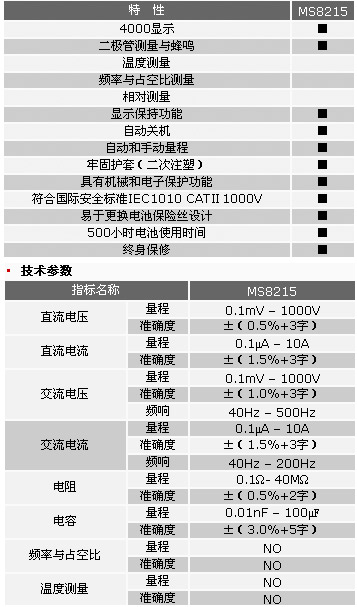 · MS8215 數(shù)字萬用表系列更注重儀表操作者的人身安全性,不僅具有電子和機械雙重保護,而且輸入量程和功能的保護可高達1000V(電流量程保護為600V)。