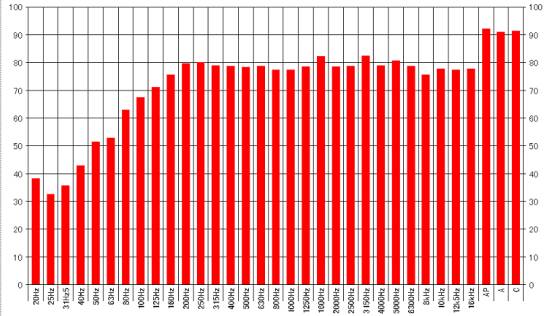 8. 頻譜特性: 見(jiàn)圖(輸入白噪聲,消聲室內(nèi)距聲源中心