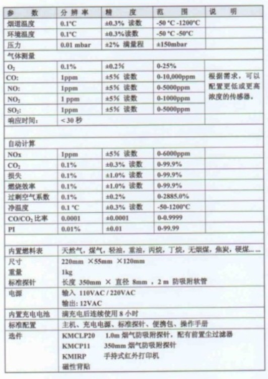 - 關(guān)鍵參數(shù):KM940手持式多組分煙道氣體分析 用于鍋爐的燃燒測試和煙氣污染排放監(jiān)測 可同時測量O2和3個污染氣體以及煙氣溫度,環(huán)境溫度,煙道壓力.傳感器 SO2, CO, NO, NO2 任選1-3個靈活組合