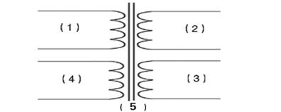 本柜機可對變壓器的任一繞阻或繞阻與繞阻或繞阻與鐵芯之間的多種多步的測試;即可測試任一繞阻的電感,匝間或直流低電阻,各繞阻之間和各繞阻和鐵芯之間的絕緣耐壓,一次性完成所有測試,方便準確高效. 圖中所示①②③④均為變壓器的繞阻,⑤為變壓器的鐵芯。如可設(shè)置為測試①的匝間,電感,直流低電阻, ①和②的耐壓, ①和⑤的絕緣, ②和④的絕緣,或有其它的多種任意組合. 所配的氣動夾具可以方便的對待測器件的各個端子進行連接。